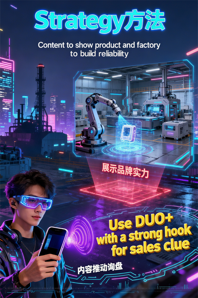 In detail, we solve by: Create content to show product and factory to build relatability, use DUO+ with a strong hook for sales clue, and use influencer or true story in our content. 我们这样解决:制作素材去展示品牌实力,增加内容曝光推动询盘,使用真实的故事.